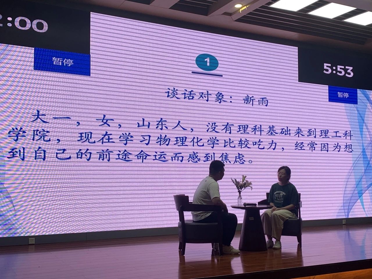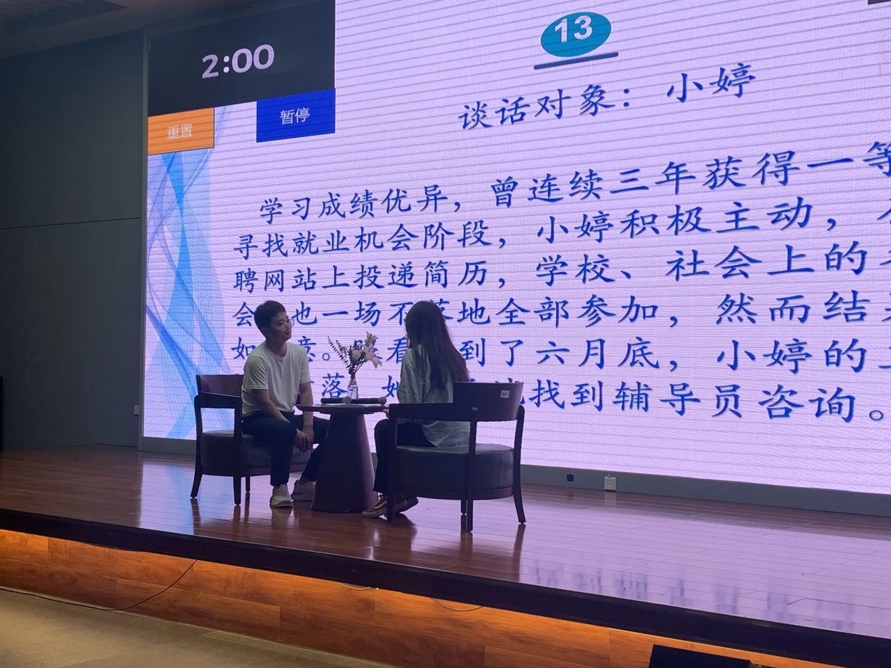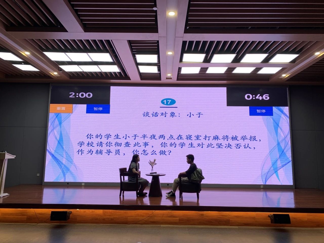 谈心谈话环节通过现场模拟与学生谈话的形式开展,参赛辅导员们分别就学生面临的问题进行谈话,根据相关知识和自身的经验对问题进行剖析、结合学生实际情况引导学生思考并选择解决路径,从而引导学生成长成才。
