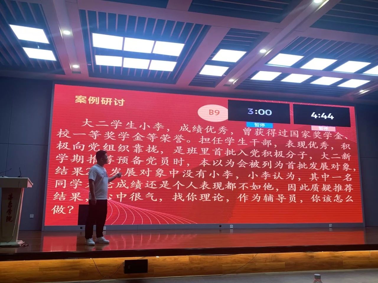 案例研讨环节采用“AB角随机组合”回答问题的方式,两位辅导员为一组,对案例进行分析、研判。该环节主要考察辅导员的职业素养及运用理论知识解决实际问题的能力,辅导员们深入研讨,围绕案例的本质、原因、解决思路及相关启示进行阐述。