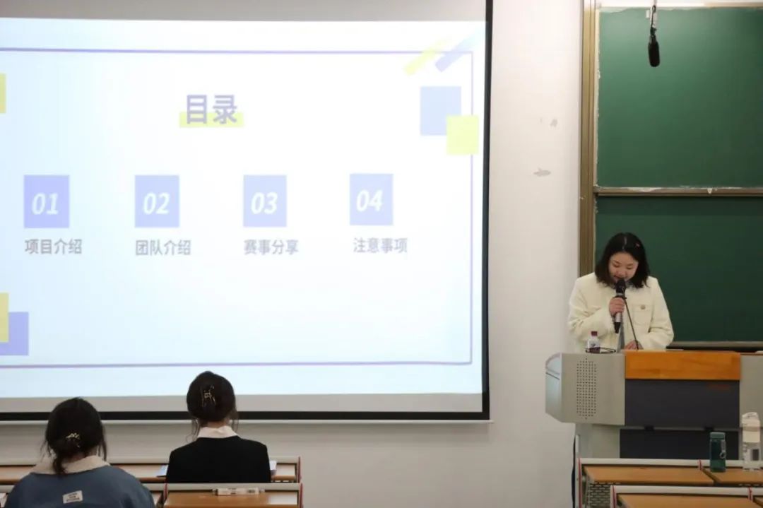 王佳同学分别从项目介绍、团队介绍、赛事分享和注意事项这四个部分,给同学们分享了她参加“挑战杯”竞赛时的所感所想与经验。