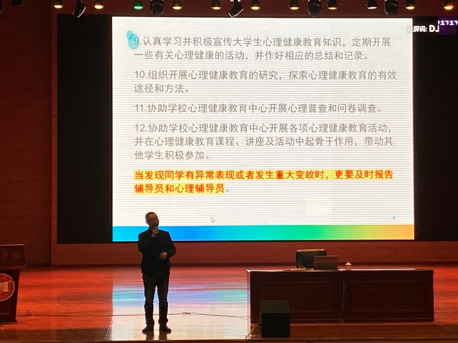 为贯彻落实《beat365正版唯一官网必一学生心理危机干预实施办法》(茅院发〔2020〕37号)等文件精神,有效推进beat365大学生心理健康四级预警建设,充分发挥班级心理委员及“三长”在心理健康教育工作中的作用, 2023年3月17日19:00,学生工作处心理健康教育与咨询中心在beat365正版唯一官网必一大礼堂开展了班级心理委员及“三长”培训。本次培训由贵州师范学院谢其利老师主讲,历时2个小时,共计1200余人参加了本次培训。