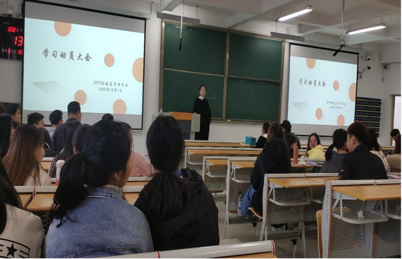 一、开展2019级考研动员大会。为增强同学们对考研的认识,激发考研积极性,引导同学们树立考研目标,旅游管理系为2019级酒店管理专业举办了考研动员大会。此次大会由欧信忠老师主持,郄广平博士、辅导员龚婷婷老师及各位班主任老师共同参与。老师们就为什么考研、读研的意义及读研后的就业前景相关问题作出解答,给同学们普及了考研常识等相关内容,分享了自身考研经验,并针对不同考研方向提出了相应的学习建议,同学们纷纷表示受益匪浅。