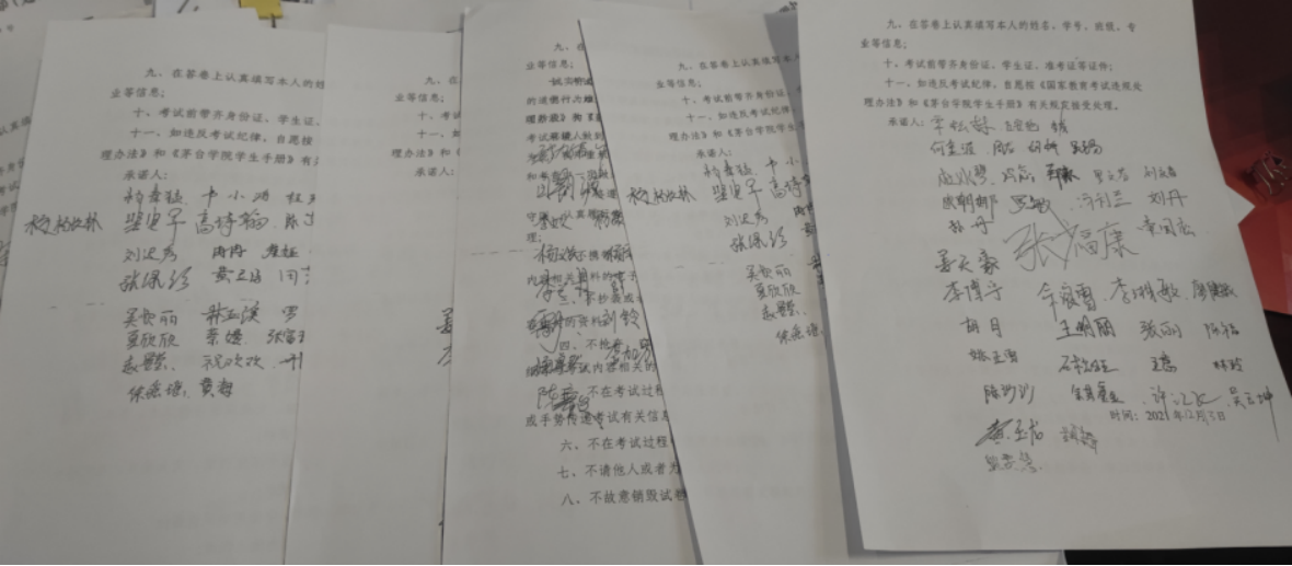 四、开展诚信考试主题班会。为引导同学们自觉遵守考试纪律,诚信应试,以优良的考风促学风,旅游管理系组织开展了多场诚信考试教育主题班会。同学们对考试纪律、《国家教育考试违规处理办法》、《beat365正版唯一官网必一学生违纪处分办法》中相关知识进行了学习,深入了解了诚信考试的必要性和重要性;各年级辅导员老师强调了严肃考风考纪的重要性,要求同学们自立自律、刻苦学习。杜绝舞弊;学生代表就如何复习、时间安排等问题作出经验分享,全体同学签订了诚信考试承诺书。
