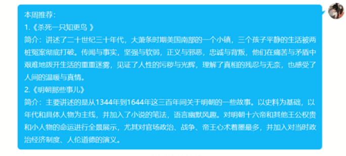 读书可以让同学们养成自学互助的学习习惯。我系每周推荐两本好书转发至班群,一个月后开展分享会,同学们能够在活动上畅所欲言,发表自己的观点,交流彼此的心得能够更加有效率,有成果地读书,从而引导同学把主要精力投入到学习上,引导同学们树立终身学习的理念,帮助同学们形成热爱学习、善于学习的良好习惯。