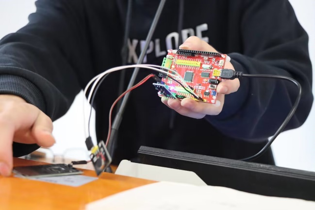 参赛的设计作品包含:秒表计时器、电子时钟、手电筒、雨滴报警器、温湿度实时监测系统等。参赛选手对作品进行了详细且专业的介绍“STC89C51单片机、SHT30温湿度传感器、发光二极管、定时器LCD显示模块、震动马达,通过在软件Keil uVision5上编写相关程序代码使两硬件所连接的引脚来相互控制作品的实际工作情况。”还有同学制作了手电筒,通过对电子器件的焊接、电路元器件的接线,让其完美运行。参赛同学的精彩展示,让评委老师和观众应接不暇。