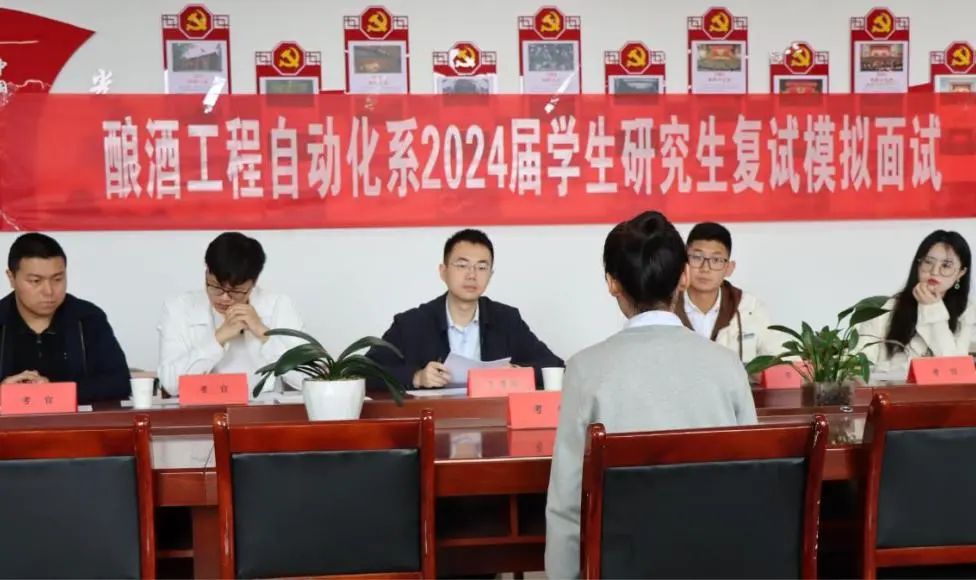 为帮助学子提前了解复试流程及相关要求,积累面试经验,针对性备考,2024年3月22日酿酒工程自动化系组织开展了2024届学生考研复试模拟面试。酿酒工程自动化系副主任王陈诚,专任教师王银龙、庞传远、黄秋红及公共基础部杨运老师出席本次活动并担任考官,2024届考研上线的10名学生参加。