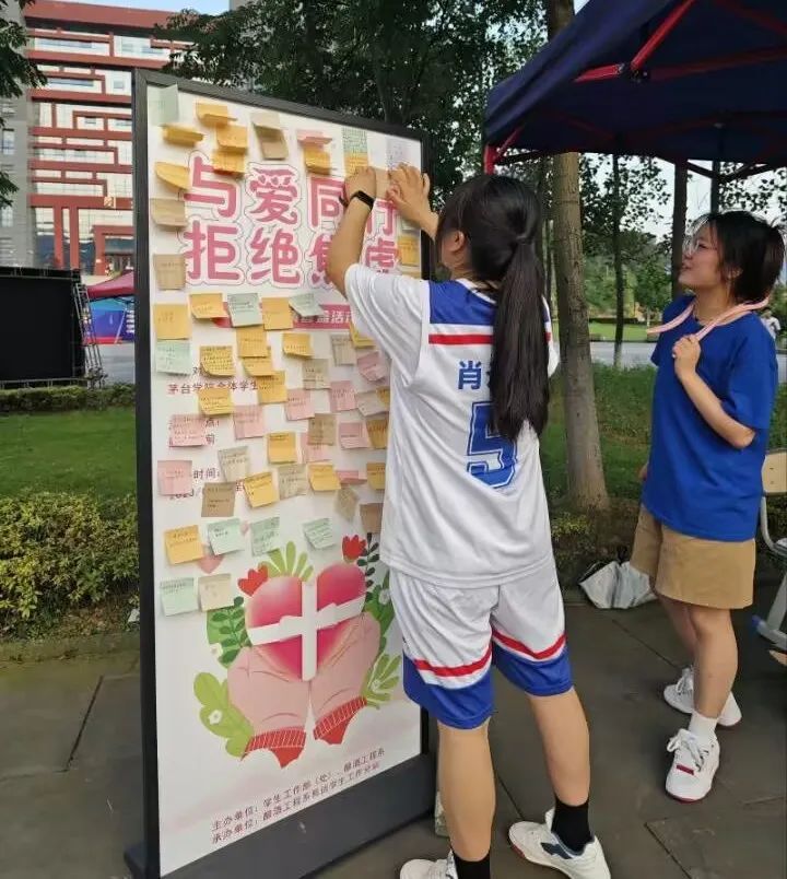 暖意予人,亦将反哺其身。流动在身边的点点善意,化成阳光点亮他人的心扉,也温暖了自己的心灵。现场,充满正能量的标签纸贴满了展板,同学们认真观看每张便签的内容,并互相交流应对焦虑的办法。