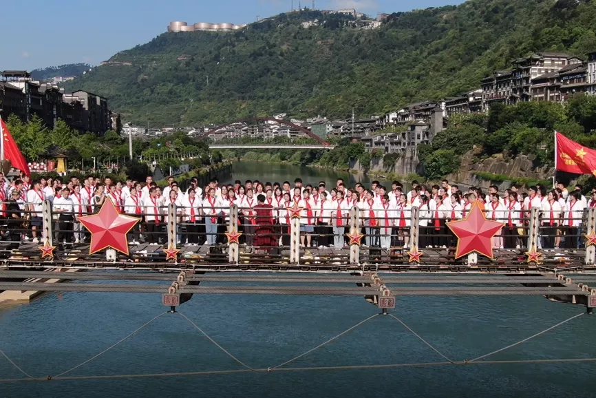 全体学员在茅台红军桥上合唱《四渡赤水出奇兵》