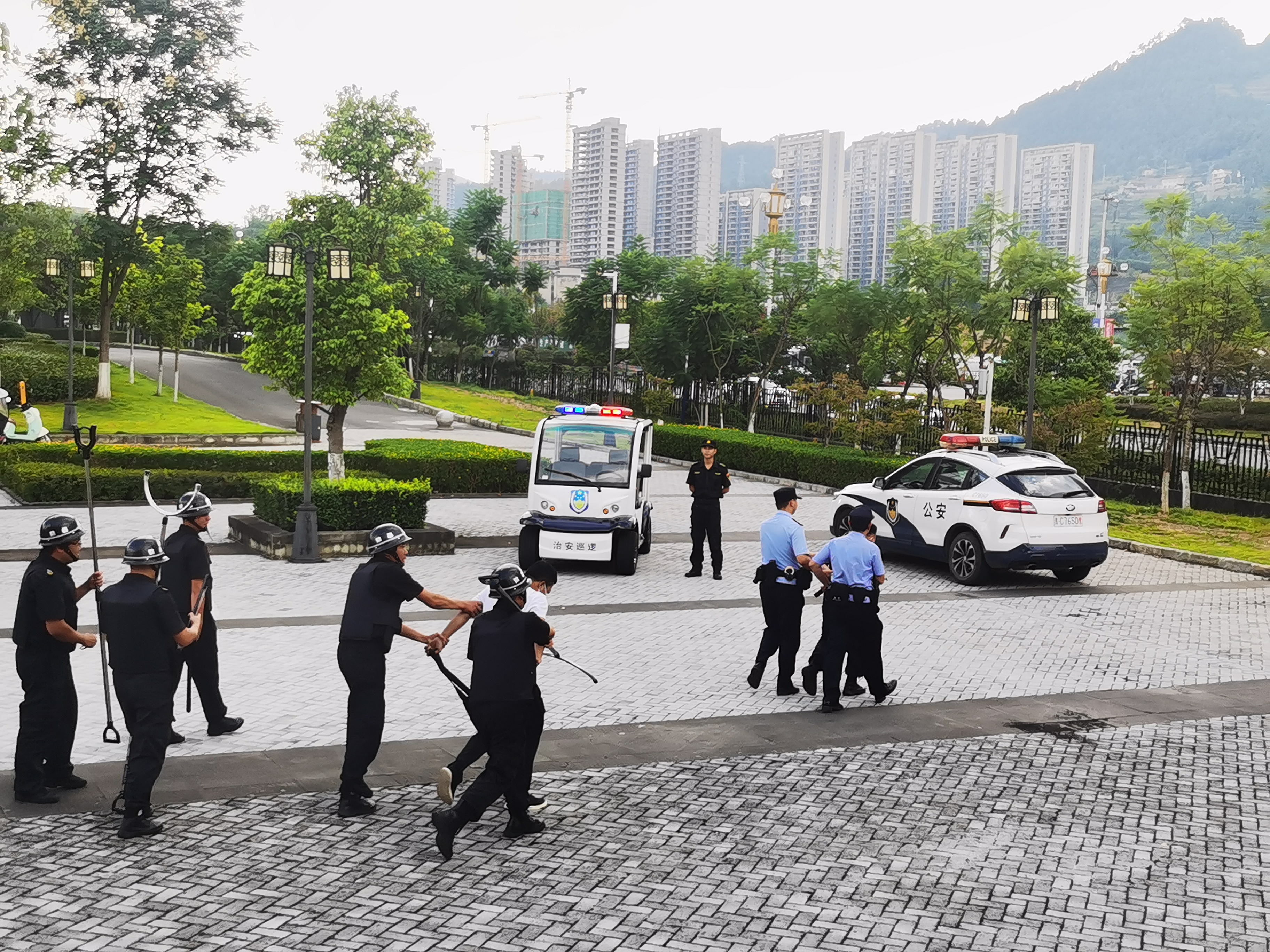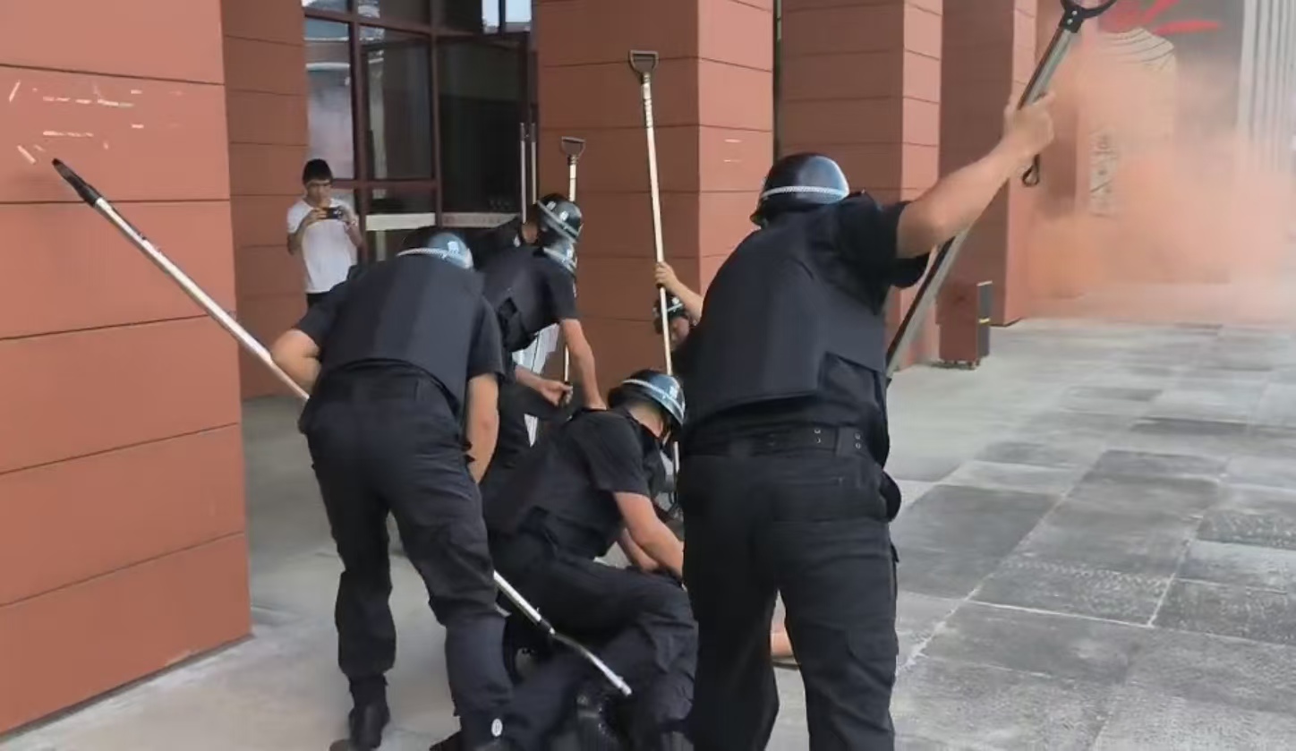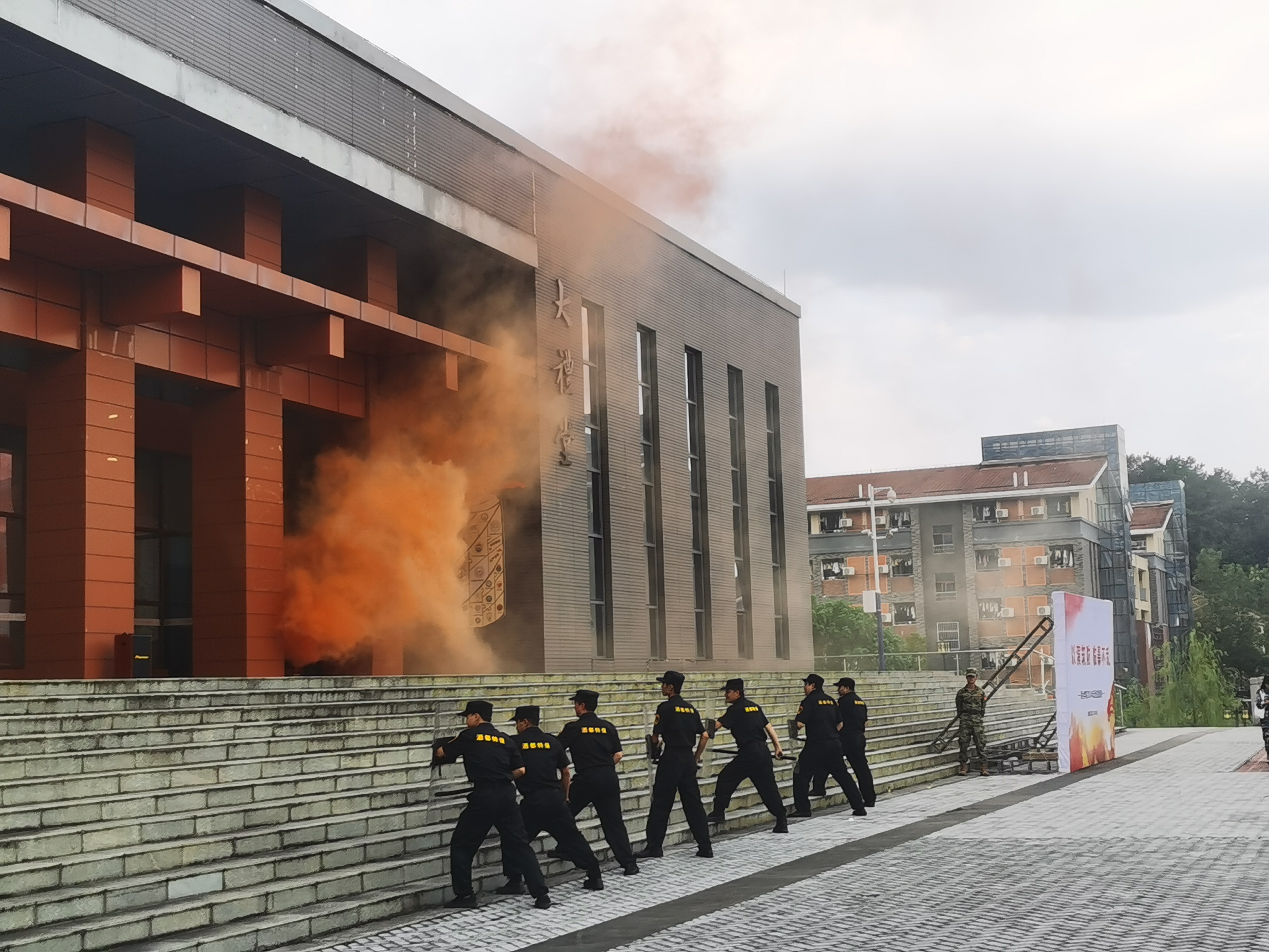 此次演练活动模拟了歹徒进校纵火、刀斧砍杀等情景,学校安保力量根据学校反恐怖先期处置最小作战单元建设工作部署,模拟了武力处置歹徒、应急疏散、扑灭火灾、医疗救护等环节。