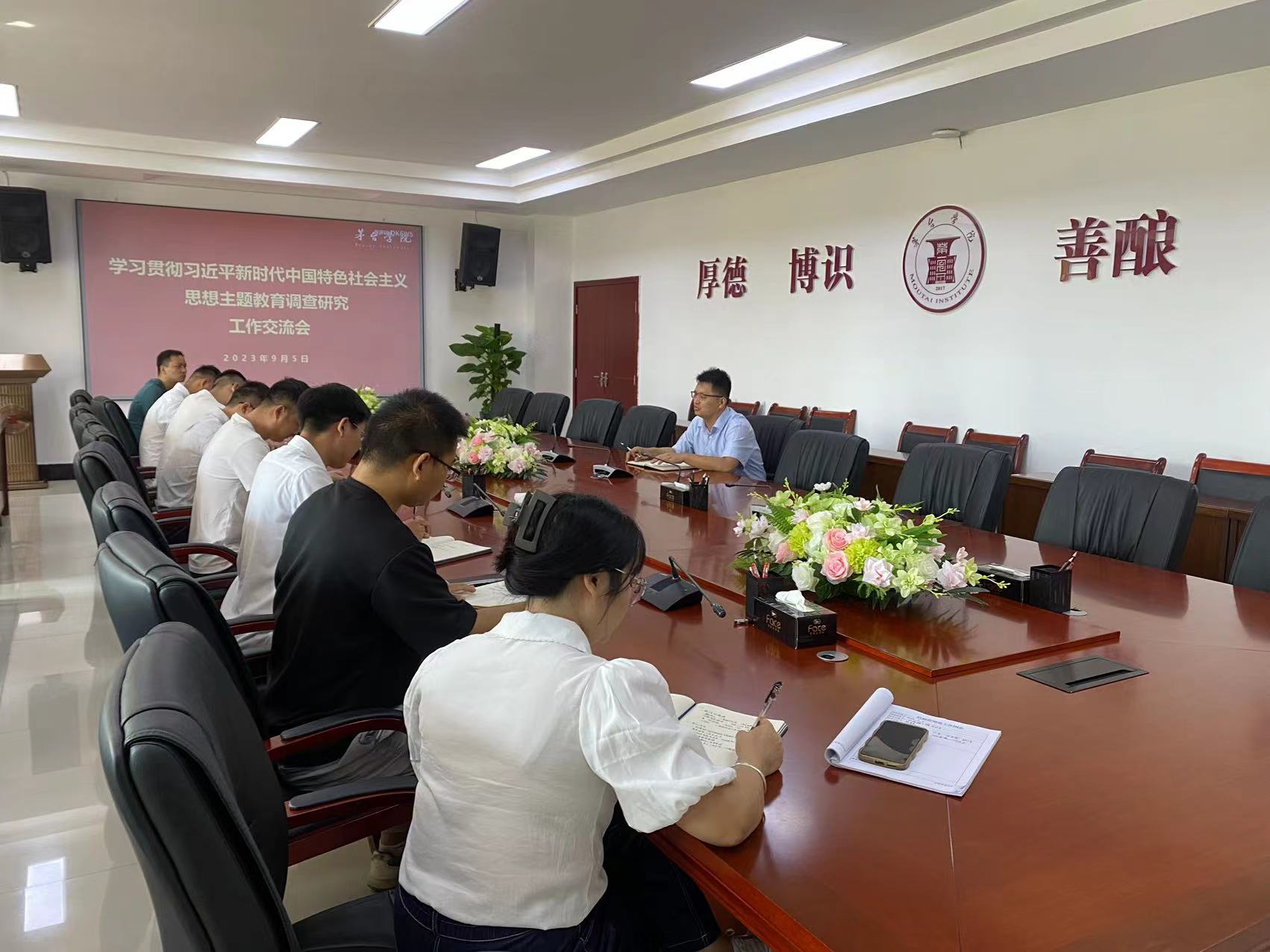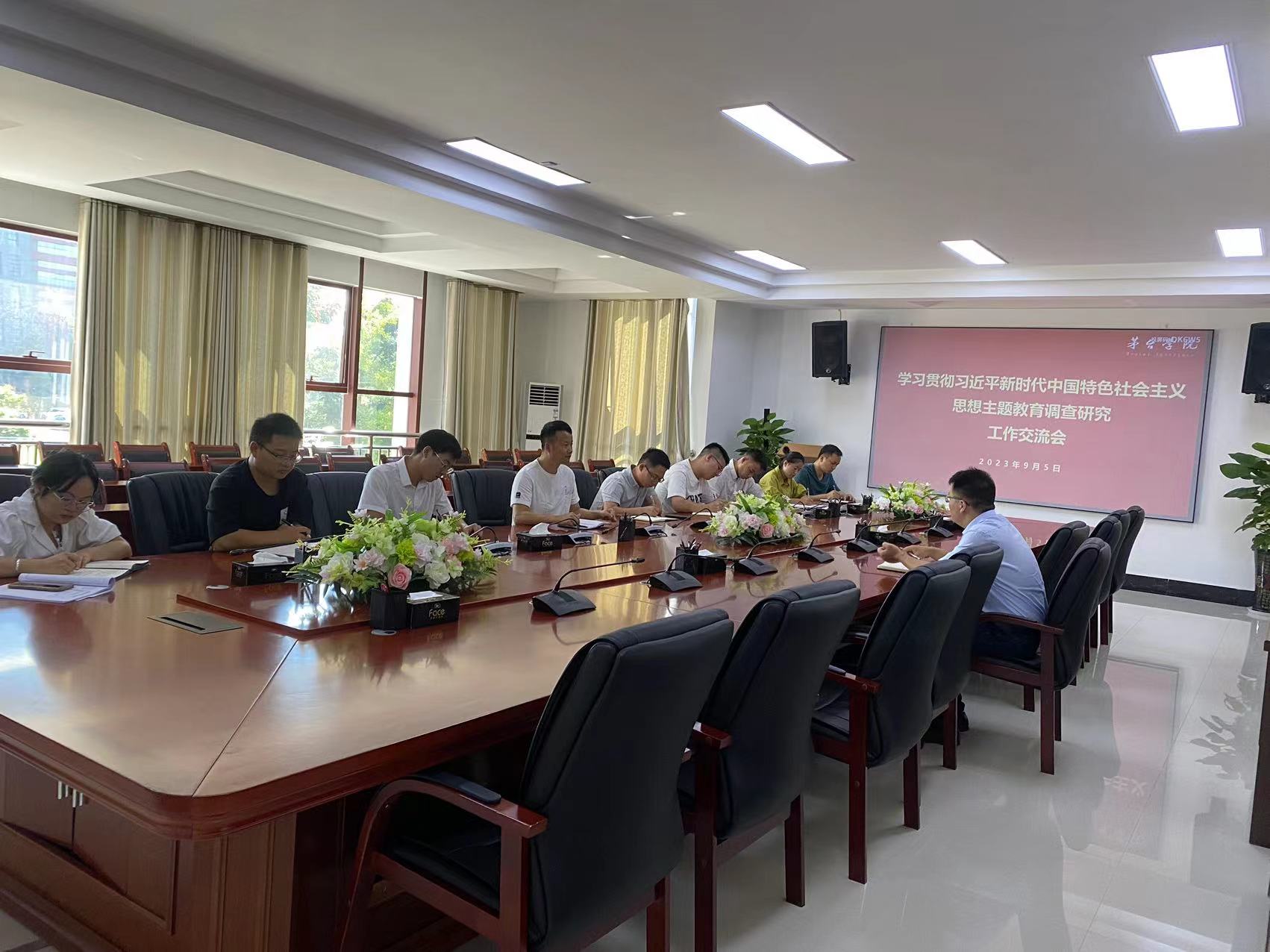 2023年9月5日上午9点半,beat365正版唯一官网必一党委委员、副校长闫松显组织后勤管理处全体人员在行政楼二楼会议室,开展学习贯彻习近平新时代中国特色社会主义思想主题教育调查研究工作交流会。