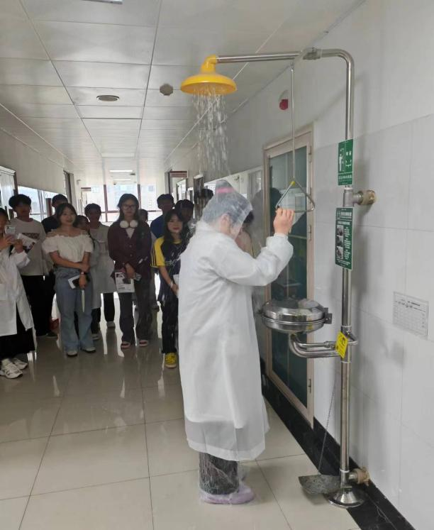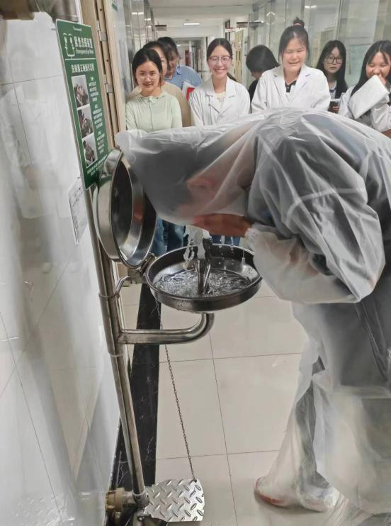 最后在老师的指导下学习和实操洗眼器及应急喷淋装置,模拟化学药品溅入眼时、身上着火时的应急自救处置方法。