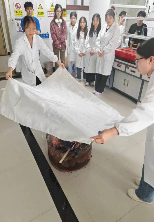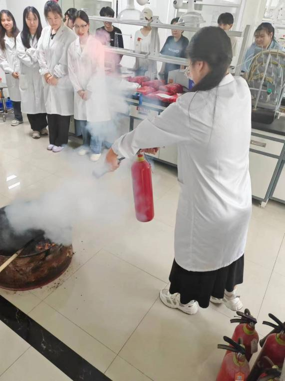 参加演练的学生首先在实验室内观看消防应急学习视频,学习熟悉灭火器、灭火毯、消防沙、防毒面具的操作方法。然后由老师演示常用安全应急物资的操作方法和知识,并现场通过酒精沾染棉布棍制造小型着火点,让学生逐个使用消防应急物资进行穿戴和灭火等实操。