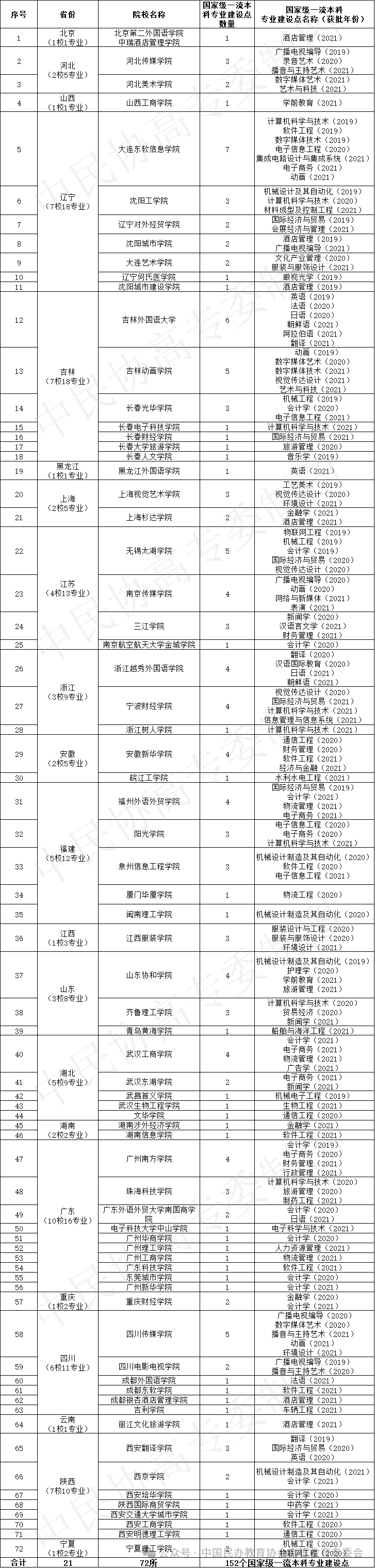 全国共有21个省份72所民办高校的152个本科专业,获批国家级一流本科专业建设点(简称“国一流专业”)。外语类、艺术传媒类等学科特色型高校,其优势专业获批国一流专业相对较多。