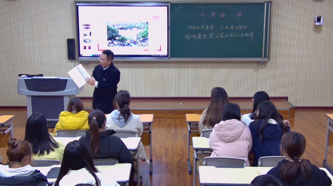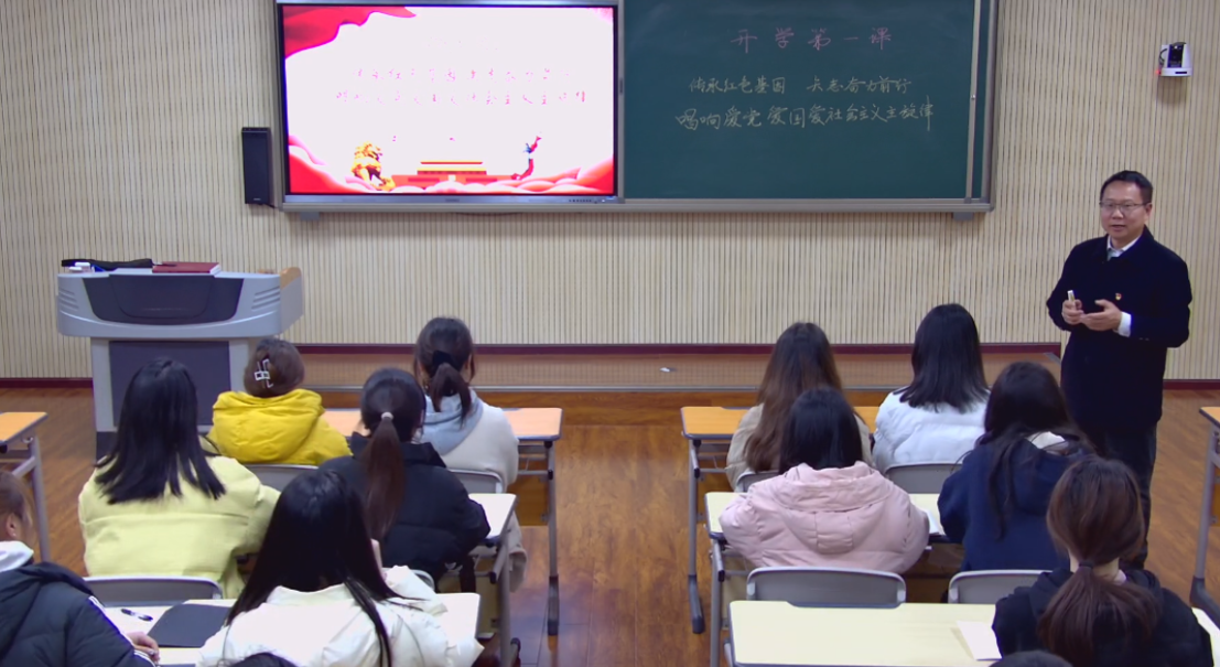 今年是中华人民共和国成立75周年,是习近平总书记“3.18”重要讲话发表5周年,同时也是《中华人民共和国爱国主义教育法》施行元年。为加强学校青年学子爱国主义教育,引导青年学子传承和弘扬爱党爱国爱社会主义主旋律,2月29日晚,公共基础教学部党支部胡玉智书记走上讲台,以《传承红色基因 矢志奋力前行,唱响爱党爱国爱社会主义主旋律》为主题,在留芳楼206教室为同学们讲授“开学第一课”。