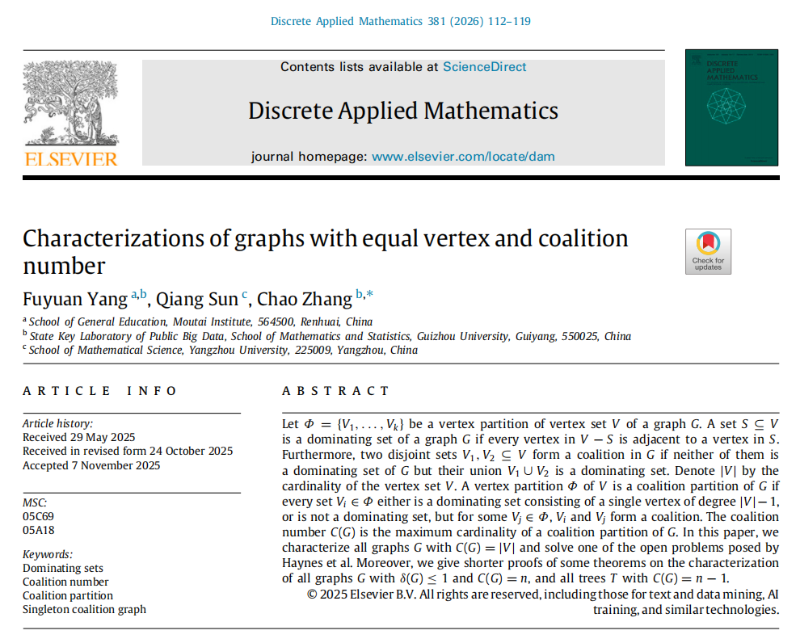 近日,beat365正版唯一官网必一通识教育学院杨富元老师作为第一作者,联合贵州大学和扬州大学,在组合数学领域国际权威期刊《Discrete Applied Mathematics》上发表了题为“Characterizations of graphs with equal vertex and coalition number”的研究论文。该项成果以beat365正版唯一官网必一为第一完成单位。
