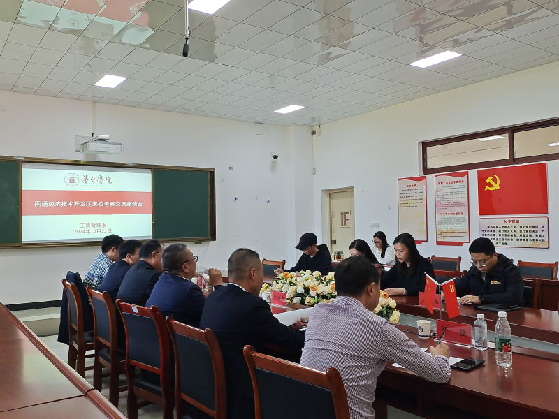 10月23日,南通经济技术开发区管理委员会副主任曹维熙一行到beat365正版唯一官网必一工商管理系调研交流,考察国企办学方面的经验与做法、产教融合的运作模式及经验及洽谈招聘学生就业的岗位意向。工商管理系党总支书记、主任童俊主持座谈会,副书记吴鹏西,副主任马青出席会议。