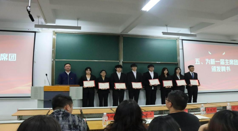 工商管理学院党总支书记吴新建老师为新一届主席团成员颁发聘书,并鼓励新一届主席团带领全体成员,以更高标准推动学院团学工作迈向新台阶。
