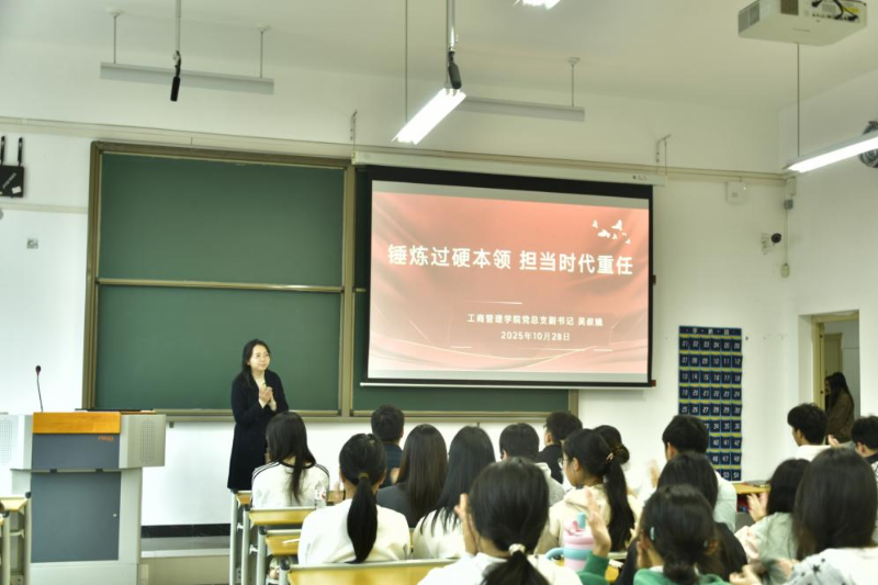 随后,培训围绕“理论+实操”双线展开。工商管理学院党总支副书记吴叔娥老师以“锤炼过硬本领 担当时代重任”为主题,从思想引领、责任担当、踏实肯干等维度,引导团学组织全体成员坚定理想信念,筑牢思想根基,练就过硬本领,提升综合素质。通过互动提问引导学生思考“学生干部的责任边界和角色定位”,并重点强调了思想引领在活动策划、日常服务中的重要性。