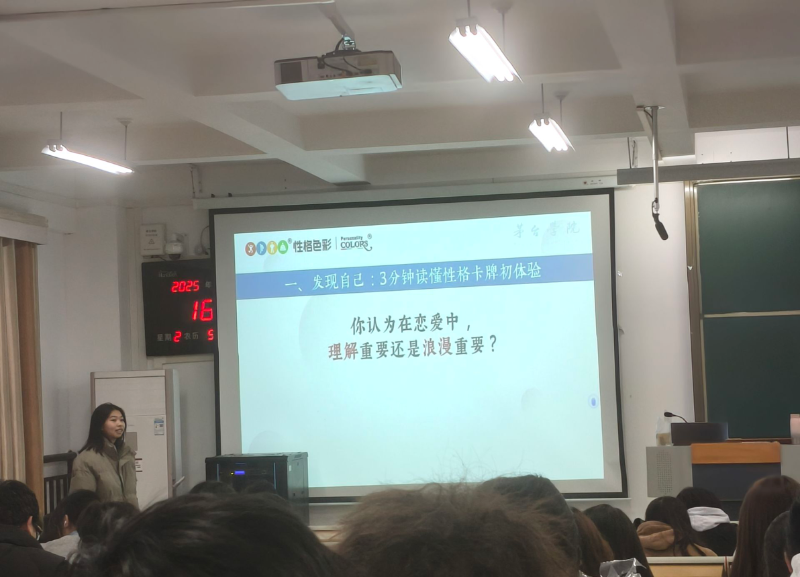讲座中,吴婷婷老师以FPA性格色彩理论为核心,用生动案例拆解红色、蓝色、黄色、绿色四种性格色彩的核心特质。针对大学生恋爱中的常见困惑,吴老师重点分析不同色彩性格在情感表达、沟通方式、需求偏好上的差异。红色性格的热情直率、蓝色性格的细腻敏感、黄色性格的果断坚定、绿色性格的温和包容,让在场学生快速定位自身“恋爱色”。