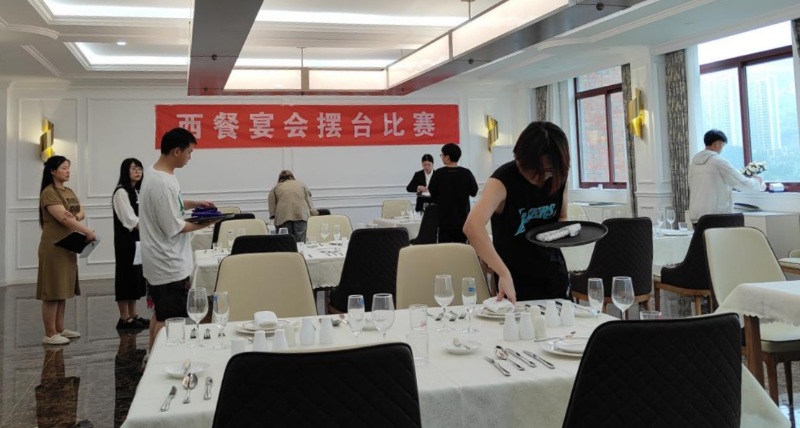在西餐宴会摆台现场,学生以优雅的姿态和熟练的操作,精准摆放餐、酒具和装饰品。通过精心的设计和布置,营造出极具氛围感的宴会场景。西餐宴会摆台比赛让学生体会到通过宴会摆台可以为顾客营造独特难忘用餐体验,这对培养具有创新、服务意识的应用型人才具有重要意义。