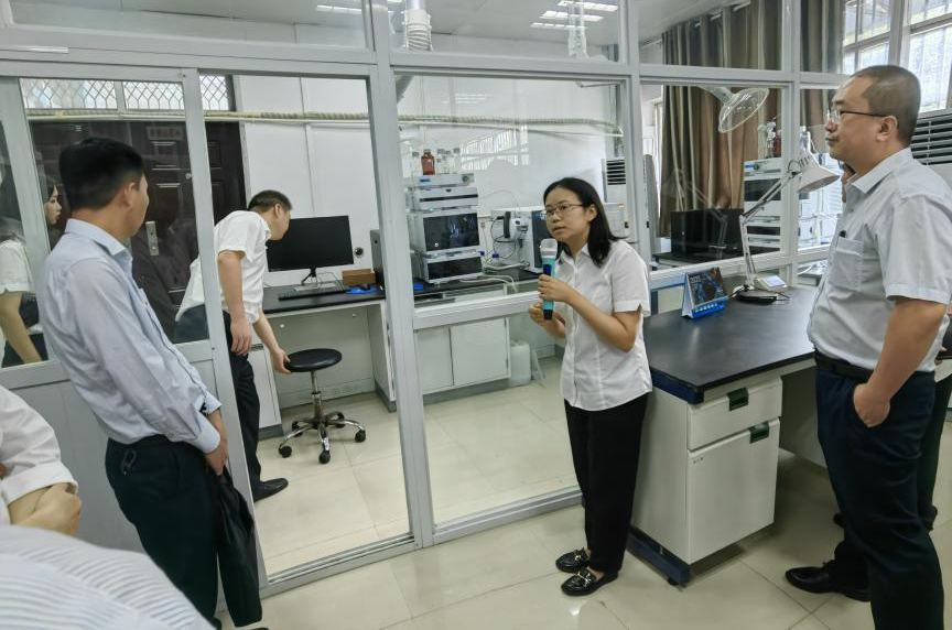活动第二部分内容,是由生产管理部第三党支部聂叶同志带领我系党员参观中心检测室,讲解目前检测室的组成情况及检测技术。现目前,集团公司生产管理现场主要是对高粱和糟醅各项理化指标进行检测。通过红外光谱技术及高效液相色谱、液质联用色谱技术能够快速完成对高粱原料的破碎率、千粒重等七个指标及糟醅样品中乙醇、乙酸等物质的检测。