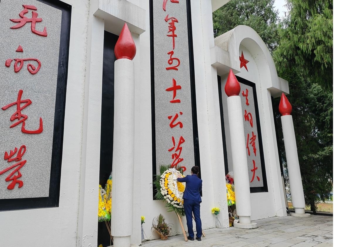 烈士芳名高墙涌,玉石花环表心灵。为缅怀在鲁班场战役中牺牲的革命先烈,在红军烈士公墓前,张珊同志整理挽联,并代表全体党员同志向革命先烈敬献花圈。