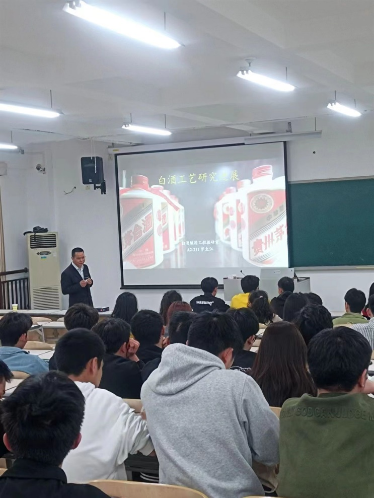 2023年3月22日,贵州茅台酒股份有限公司制酒车间主任罗太江为我系白酒酿造工程专业学生讲授《白酒工艺研究进展》之白酒风味概论及白酒风味物质与品质关系相关课程。