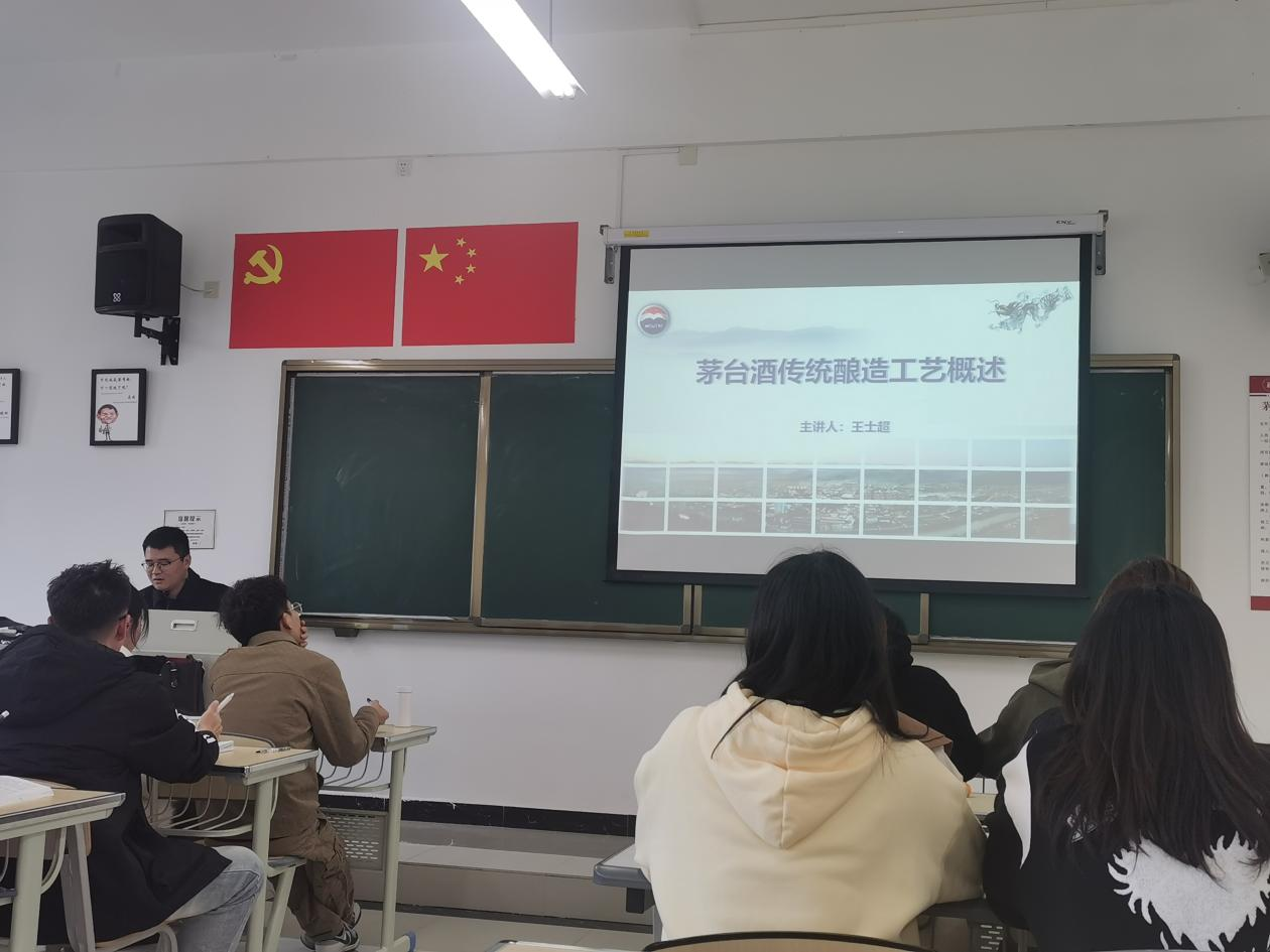 王主管从茅台酒的时-空-位-链、茅台酒生产工艺概述、茅台酒酿造工艺的传统与科学、茅台之美四个方面的内容向同学们展开了深入浅出的讲解,并结合自己的生产管理经验分享了制酒过程中工艺控制参数对酱香型白酒质量的影响。将白酒生产相关的知识和实际生产经验密切结合,让理论变得鲜活,让课堂更加生动,帮助我系学生进一步理解酱香型白酒的生产工艺。同时他呼吁同学们走进酱香大曲酒的生产车间进行深入学习,加深对制酒工艺的理解。课堂上,同学们聚精会神地听讲,争先恐后地发言,专心致志地学习,现场氛围良好。