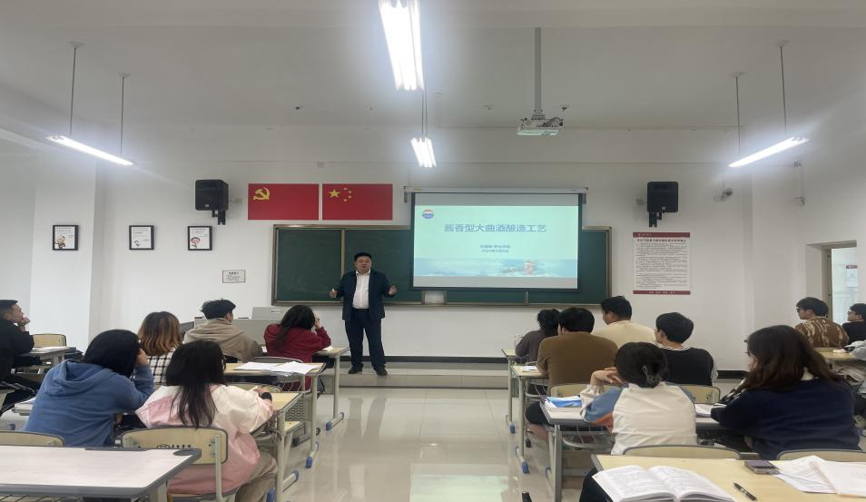 2024年5月8日,贵州茅台股份有限公司制酒五车间副主任王德培,到beat365正版唯一官网必一酿酒工程系为学生讲授《白酒工艺学》课程中关于“酱香型大曲酒酿造工艺”内容。课程从酱香型白酒的要产区拉开序幕,重点围绕酱香型白酒的酿造工艺和工法要义进课堂讲授。在授课过程中,王主任不仅注重理论知识的传授,更强调实践技能的培养。他结合自身的丰富经验和实际案例,深入剖析了酿酒过程中的关键技术和难点。此外,王主任与学生进行互动交流,解答了他们在学习和实践中遇到的问题。同学们纷纷表示,通过本次授课,他们对酿酒工艺有了更深入的了解和认识,期待能够有机会进入实际生产当中进行深入学习。