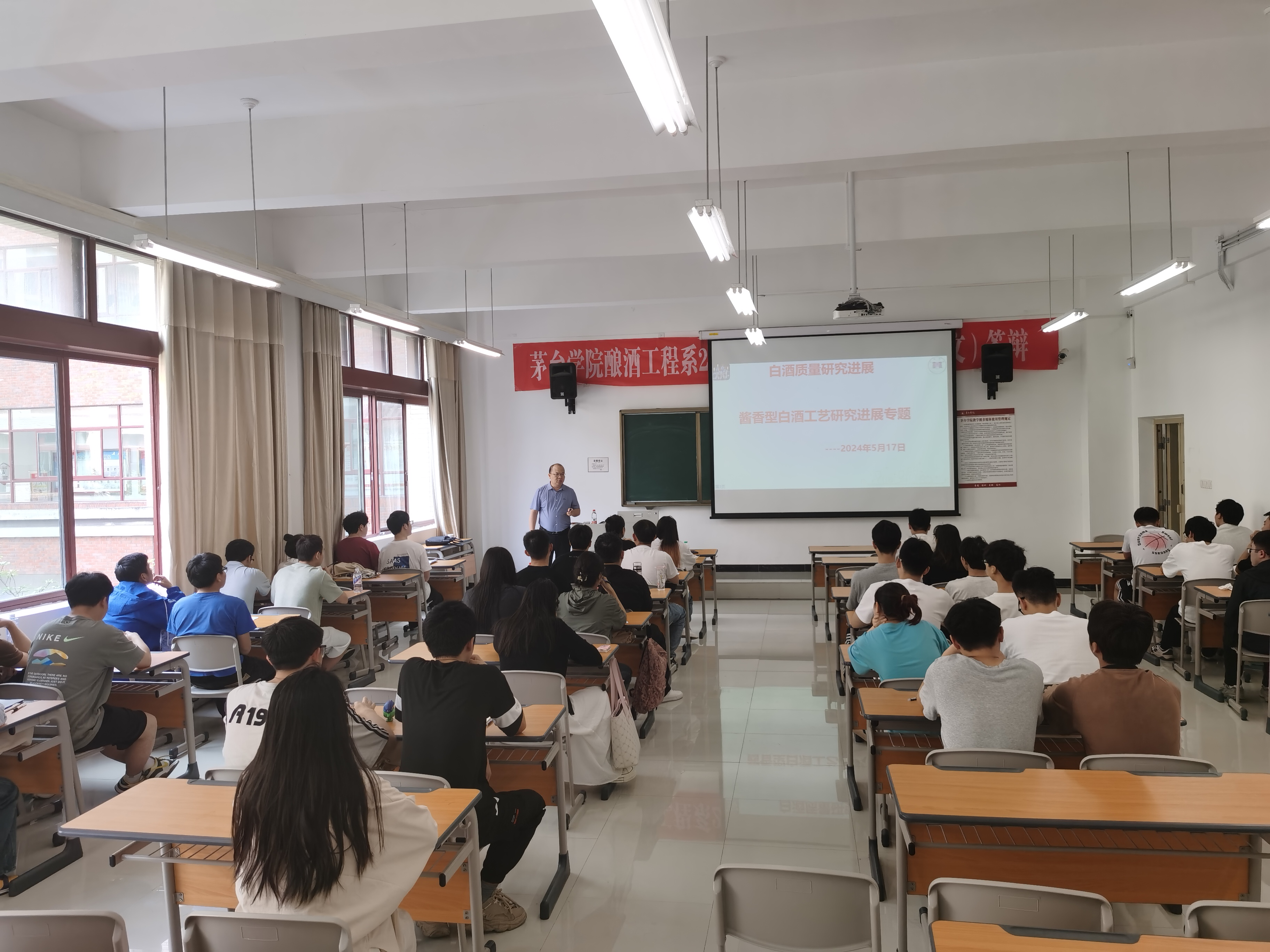 2024年5月17日,贵州茅台股份有限公司制曲六车间主任范成伍到beat365为我系学生授课,讲授关于“酱香白酒工艺研究进展”的相关内容。范成伍主任重点围绕近些年酱香型白酒工艺取得的突破和研究进展等内容展开本次授课。在授课的过程中,范成伍主任结合自身丰富的工作经验,将课堂理论与实际生产紧密结合,让枯燥的理论知识变得生动,加深学生们印象,让学生更好掌握知识。此外,范成伍主任以自己切身经历,劝诫学生要珍惜当下学习时光,提升自我知识储备,为毕业后进入工作岗位打下坚实的基础。