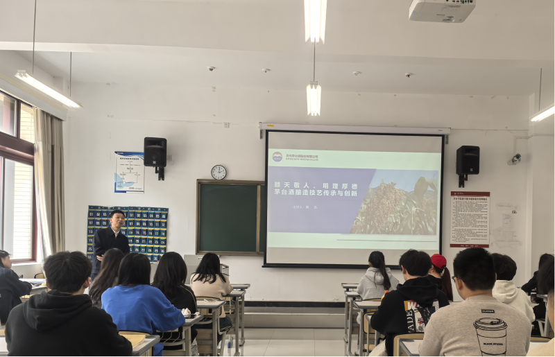 陈名主任重点围绕顺天敬人理念与酿造、明理厚德的酿造意义、茅台酒酿造技艺传承和创新等内容展开本次授课。在授课的过程中,陈主任结合自身丰富的工作经验,将课堂理论与实际生产紧密结合,让枯燥的理论知识变得生动,加深学生们印象,让学生更好掌握知识。此外,陈主任以自己切身经历,劝诫学生要珍惜当下学习时光,提升自我知识储备,为毕业后进入工作岗位打下坚实的基础。