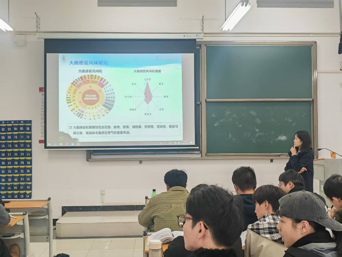 讲座伊始,陈超主管从基础概念入手,系统梳理了高温大曲在白酒酿造,尤其是在酱香型白酒体系中的独特地位与核心作用。她详细解析了高温大曲“端午制曲、重阳下沙”的时令奥秘,以及从原料处理、曲坯制作到入房堆积、翻曲、培养、贮存陈化等一系列复杂而精妙的制作工艺流程,让同学们对“一曲成而百味生”的艰辛与智慧有了初步理解。