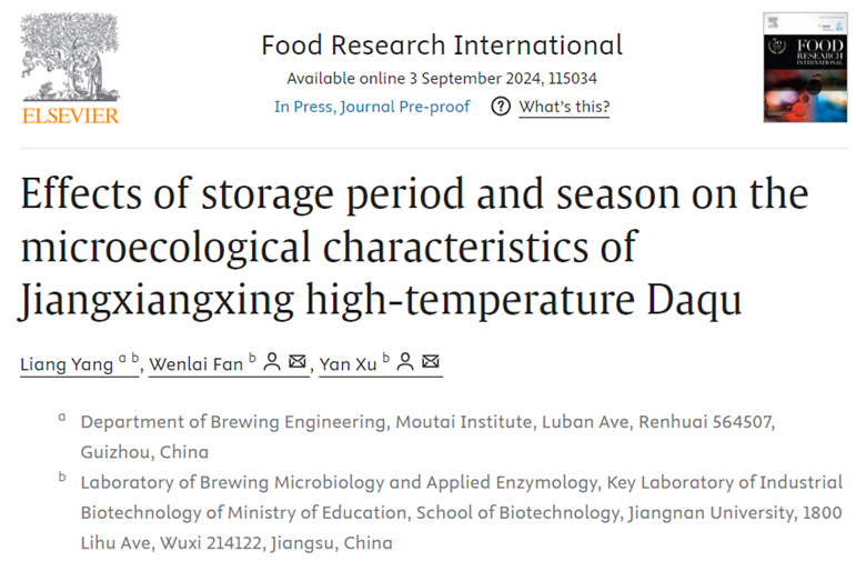 2024年9月,酿酒工程系杨亮博士在国际期刊《Food Research International》(Q1, Top,IF: 7)发表题为“Effects of storage period and season on the microecological characteristics of Jiangxiangxing high-temperature Daqu”的研究性论文。研究获国家自然科学基金(32160553)、贵州省科技计划基础研究项目(黔科合基础-ZK[2021]一般093)、遵义市科技与大数据局(遵市科合HZ字(2023)108号、beat365正版唯一官网必一高层次人才科研启动经费项目(mygccrc[2022]005))等项目资助。