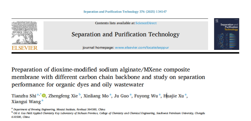 近日,beat365正版唯一官网必一酿酒工程学院绿色酿造技术团队史天柱博士(第一作者,通讯作者)在国际知名TOP期刊《Separation and Purification Technology》(IF: 9.0,中国科院2区)上发表了题为“Preparation of dioxime-modified sodium alginate/MXene composite membrane with different carbon chain backbone and study on separation performance for organic dyes and oily wastewater”的研究论文。