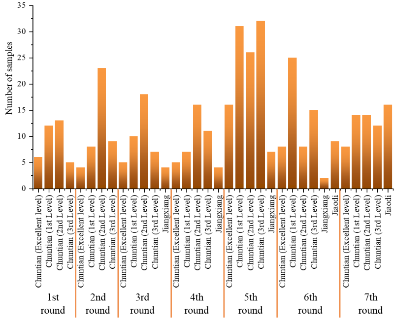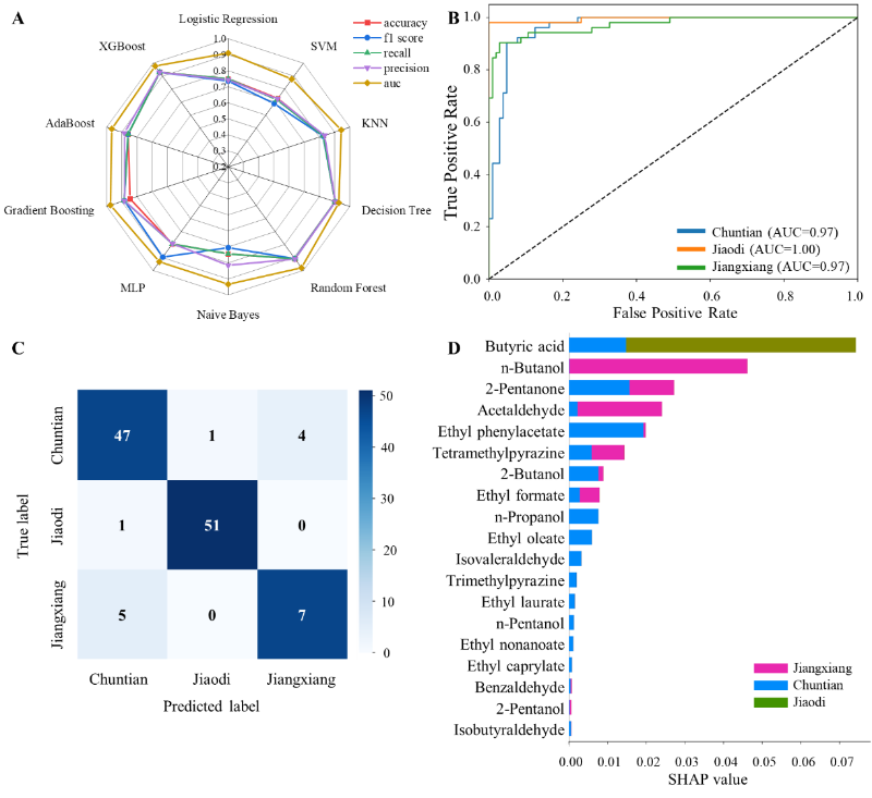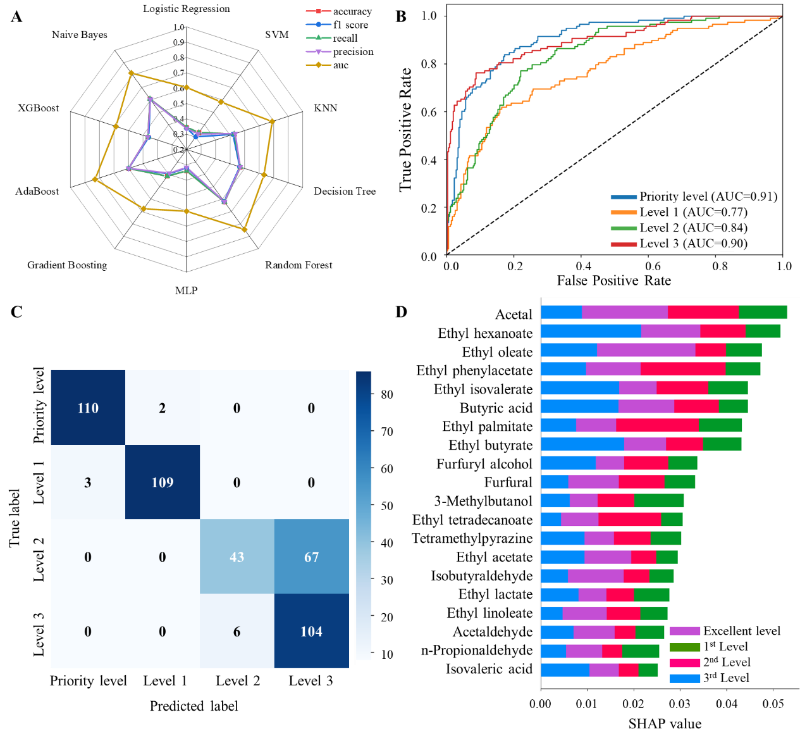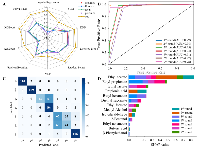 酱香型白酒在酿制过程中,会因轮次、典型体等级等差别,形成多种类型的基酒。正因多特性基酒的存在,为酱香型白酒口感及香气丰富度的形成提供了必要的基础。然后现阶段对这些基酒的判别,仍以人工为主,给勾调效率的提升及品质得稳定造成了一定阻碍。基于此,本研究采用10种机器学习模型,分别对基于GC-FID检测的410个基酒中的挥发性物质进行分析,Decision Tree、XGBoost和Random Forest依次是预测轮次、典型体等级的最佳模型,准确率在62.3%-92.9%之间。基于最佳模型的SHAP分析发现,酯类是判别轮次的主要标志物,酯类结合三甲基丁醇可用于不同等级醇甜基酒的判别,而判别不同典型体需要的物质类别种类较多,包括丁酸、四甲基吡嗪、2-丁醇等。进一步结合基酒的9个感官维度与物质的风味特性之间的关系可以发现,用于不同类型基酒判定的标志物,不仅与其含量有关,物质的风味特性同样是决定其成为标志物的关键因素。