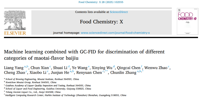 茅台学院于2025年5月在国际期刊Food Chemistry: X(Q1,Top,IF: 8.2)发表题为“Machine learning combined with GC-FID for discrimination of different categories of maotai-flavor baijiu”的研究性论文。研究获国家自然科学基金(32460269)、贵州省基础研究计划重点项目(黔科合基础ZD[2025]018)等项目资助。