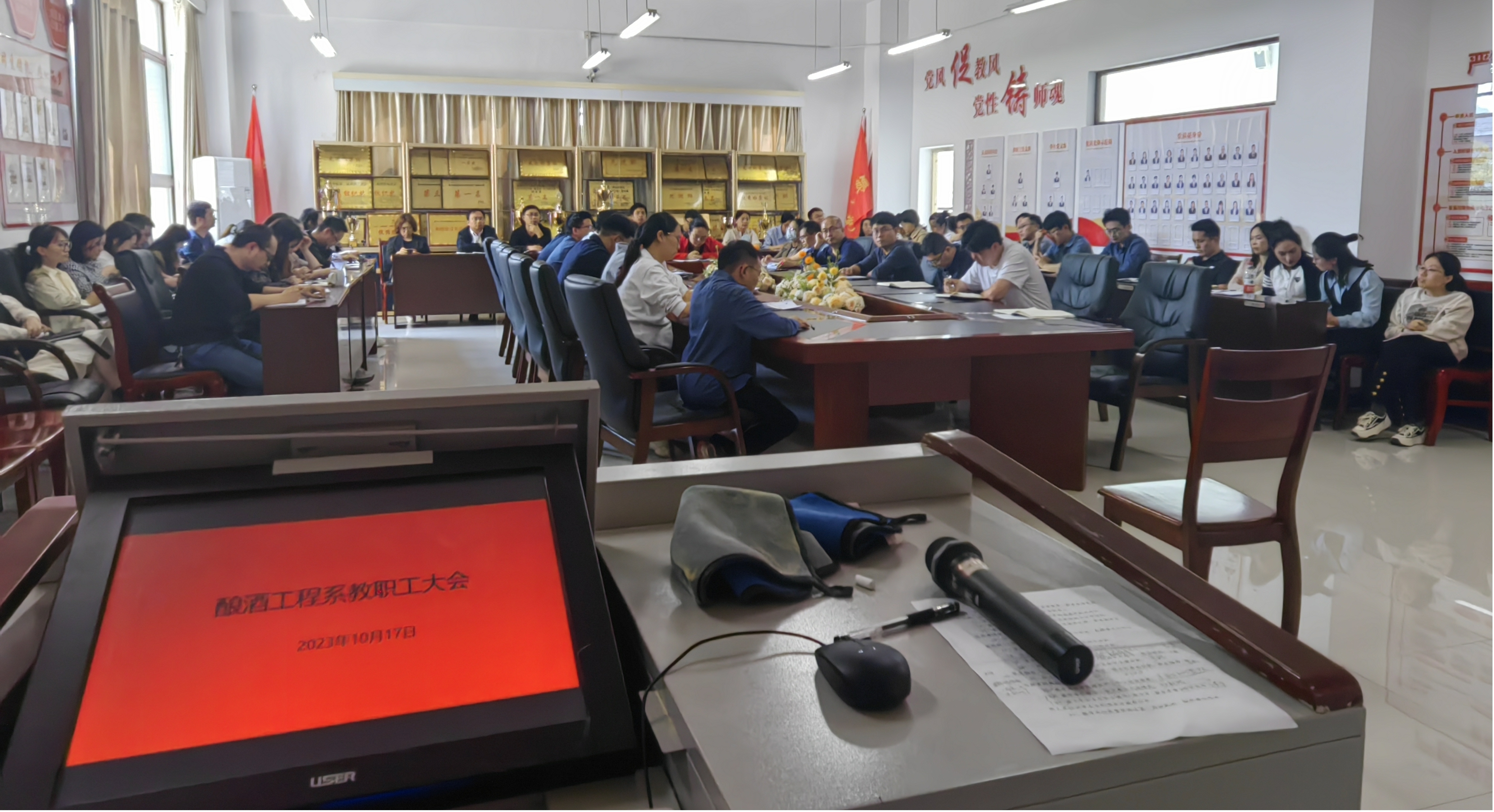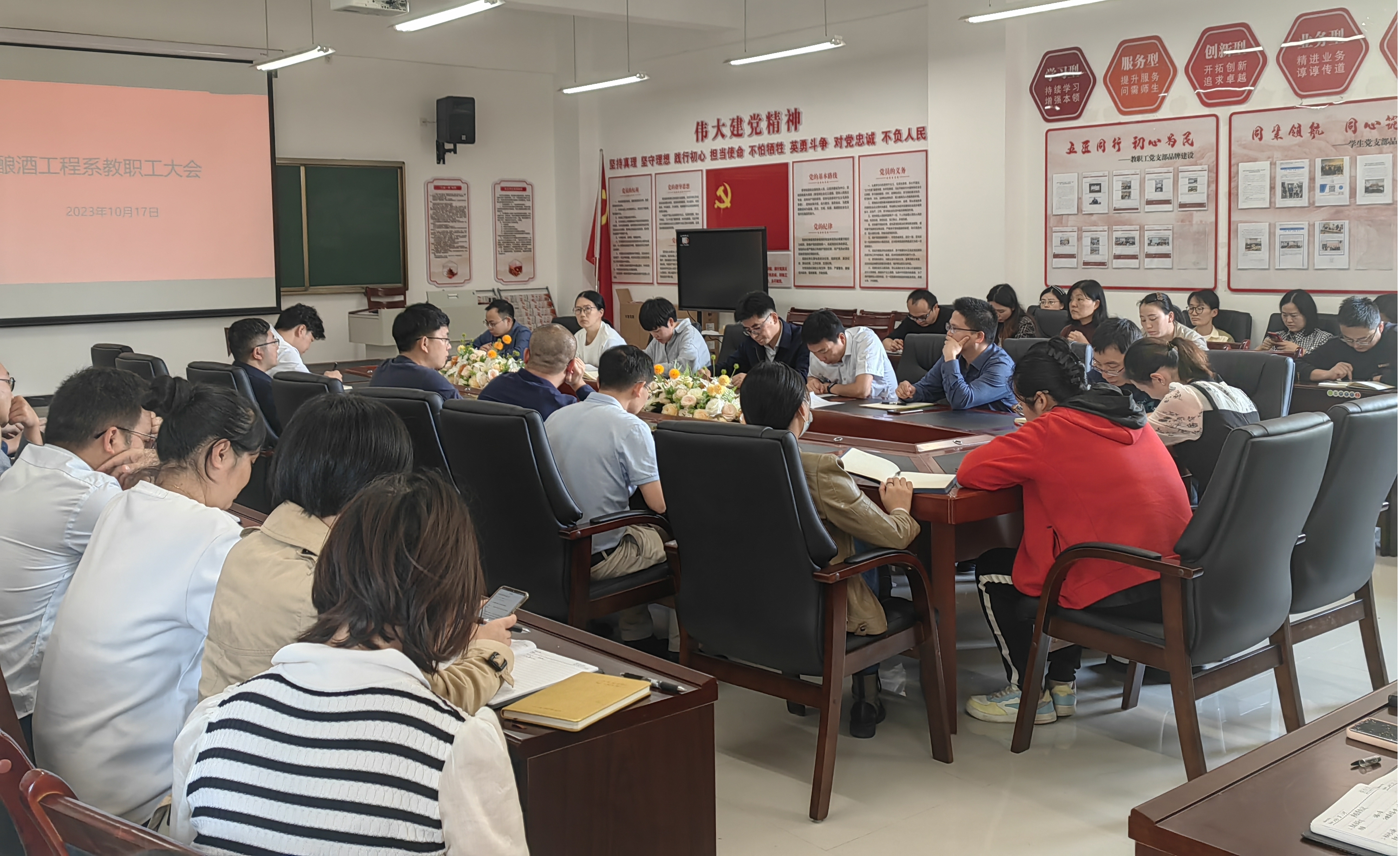 为全面提升以评促建、以评促改的工作实效,凝心聚力打赢本科教学合格评估“攻坚战”,酿酒工程系于2023年10月17日下午14:00召开了全系教职工大会。会议由我系党总支书记、主任郭举主持,学校党委委员、副校长张春林莅临指导,全体教职工参加。