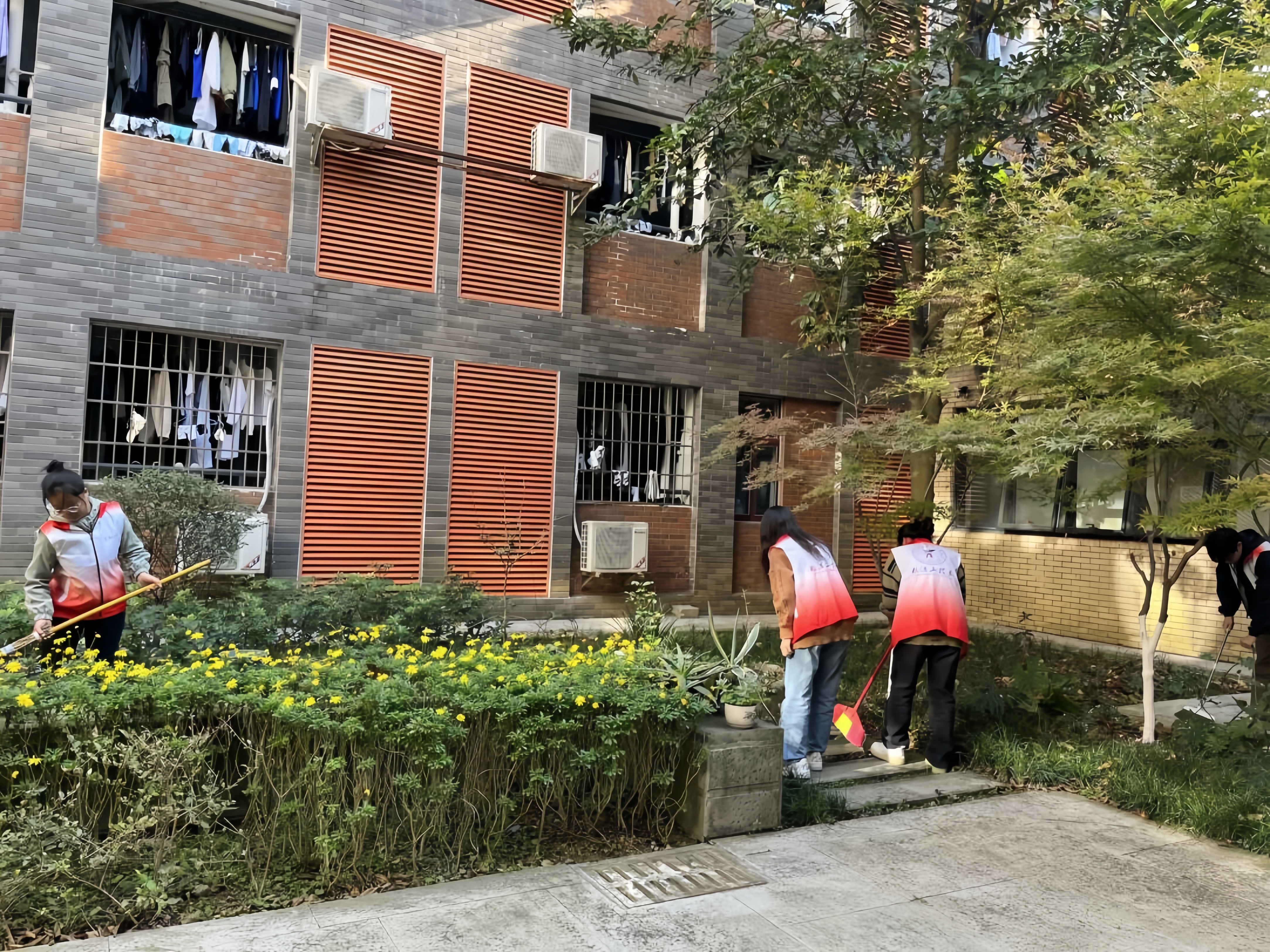 暮秋的茅院虽气候尚暖,但社区前的中庭已积了一层落叶,志愿者们利用课余时间,将落叶扫至灌木丛中,既保持了庭院的整洁,也为灌木提供了营养。除了落叶,庭中还有一些人为丢弃的垃圾,志愿者们不辞辛劳将其拾起,使中庭重归整洁。