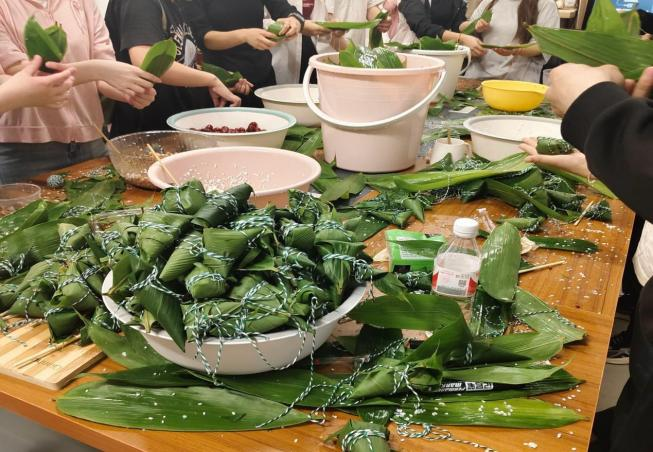 活动现场热闹非凡,桌上摆放着糯米、粽叶、蜜枣、红豆等包粽子的食材。师生之间互相交流,细心清洗每一片粽叶,认真包好每一个粽子。包好的粽子味道各不相同,咸粽以包裹火腿、肉类等馅料为主,味道浓郁,口感丰富;甜粽则以红枣、豆沙为主,香味扑鼻,糯滑可口。