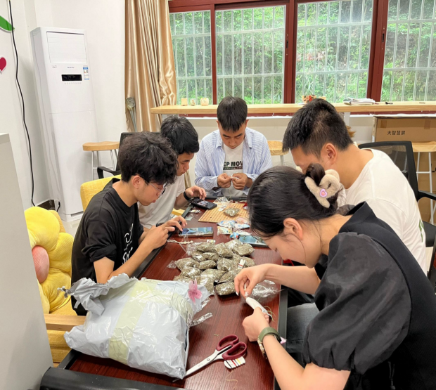 活动现场色彩鲜艳的布料、香气袭人的香料以及各类针线工具等一应俱全,老师与同学们开始了趣味的DIY活动。老师和同学们互相交流着装香囊以及系五彩绳的手法,大家将五彩斑斓的绳子交织在一起,编织出了一条条精美的彩绳手链。缝香包环节,大家围坐在一起,穿针引线,仔细缝制,缝好后的香囊装入艾叶,一个个立体饱满又带有浓浓艾叶香味的香囊很快就完成了。现场一片欢声笑语,洋溢着浓厚的节日氛围。