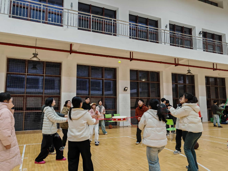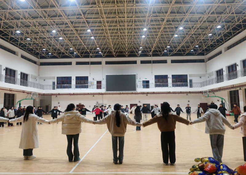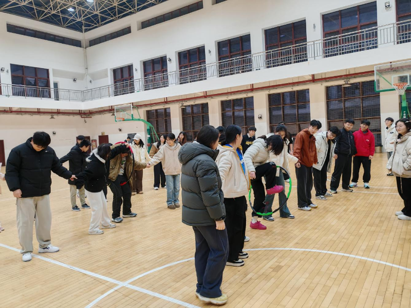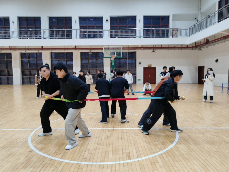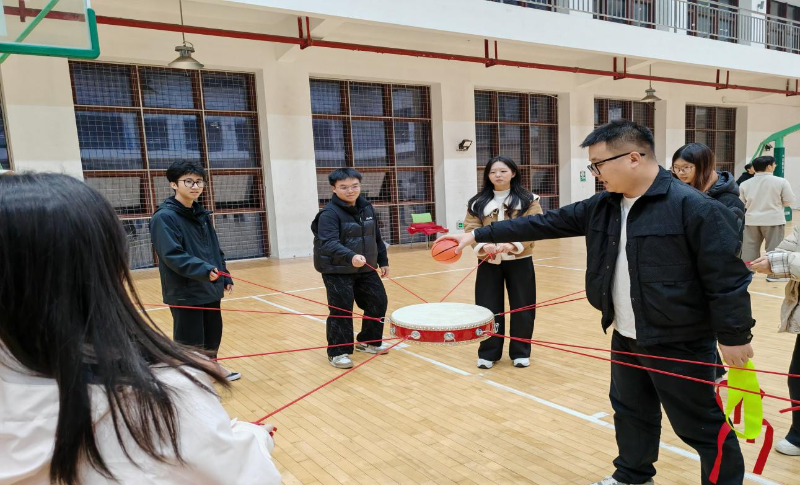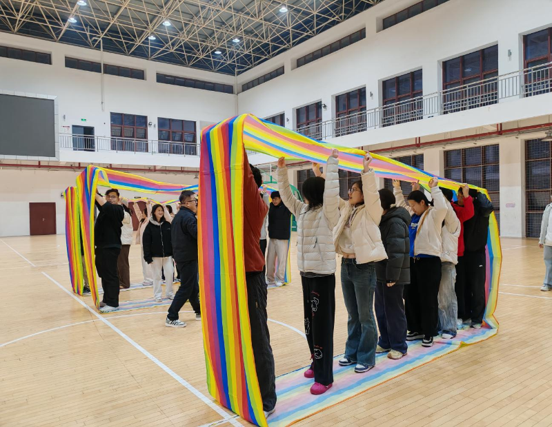 随后,全体成员转场至风雨操场,进入素质拓展挑战环节,在郭蓉老师的组织下,同学们通过随机分组、创建队名与口号完成破冰,迅速融入团队氛围。
