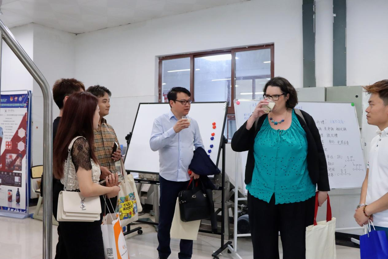 座谈会后,一行人来到我系实验室参观啤酒生产线。我系负责人为走访团详细介绍了实验室啤酒发酵设备、发酵流程等,邀请大家品尝我系生产的特色啤酒,并就啤酒生产、风味、品评等展开交流。