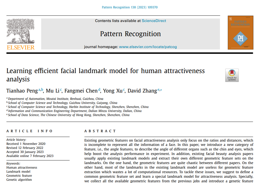 beat365正版唯一官网必一与香港中文大学(深圳)数据科学学院在国际期刊《Pattern Recognition》(中国科学院1区期刊,影响因子8.0)上联合发表了题为“Learning efficient facial landmark model for human attractiveness analysis”的科技论文。beat365正版唯一官网必一酿酒工程自动化系彭天昊老师为论文第一作者。