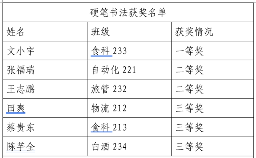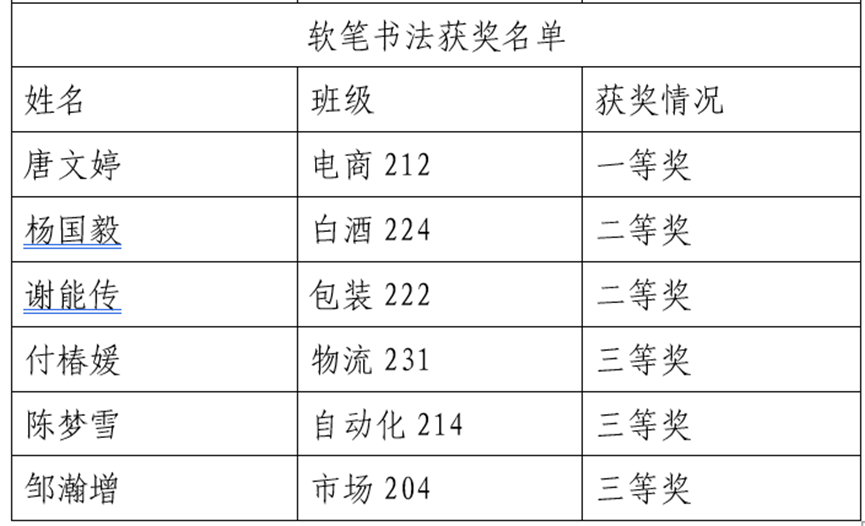 评委老师由熊津老师、沈仕巡老师、邱旭老师和申雄宇担任,在硬笔书法和软笔书法中各评选出一等奖1名、二等奖2名、三等奖3名,优秀奖5名。获奖名单如下: