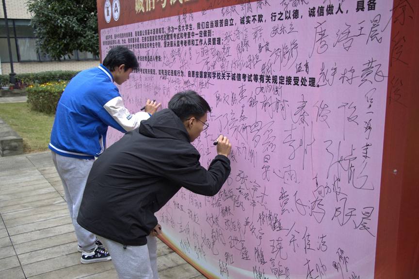 除了现场书法比赛,本次活动还开展了“诚信考试签字墙”签名活动,同学们纷纷签字承诺要做到“艰苦自立、诚实不欺、行之以德、诚信做人,在考试中诚实守信,自觉遵守考试有关规定。”签名活动进一步加强了同学们的诚信意识。