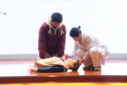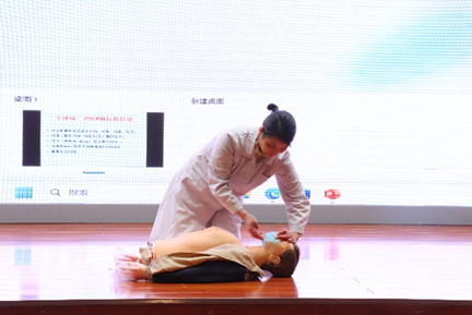 同时,陈照玲副院长和李晓梅护士长还为同学们讲解和示范心肺复苏的正确方式,李晓梅护士长以一组触目惊心的数据切入心肺复苏(CPR)教学环节,逐步拆解了急救流程:从评估环境安全、判断患者意识,到胸外按压的深度、频率,再到人工呼吸的操作要点,讲解清晰直观。为增强沉浸感,现场设置“模拟急救情形”。李晓梅护士边讲解边进行实际操作演。为了让大家更好地掌握心肺复苏技能,会场现场设置了实践操作环节,大家纷纷踊跃参与,在专家的指导下,认真模拟操作,逐渐掌握要领。