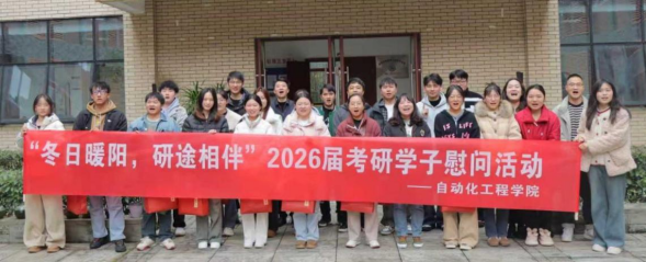 为切实关心2026届考研学子的备考状态与生活需求,2025年12月9日,自动化工程学院在一站式学生社区组织开展了“冬日暖阳、研途相伴”考研慰问活动。学院党总支书记欧信忠、副书记肖启霞、学生工作室主办骆娜及2022级辅导员申雄宇深入备考一线,为奋斗中的考研学子送去关怀与祝福。