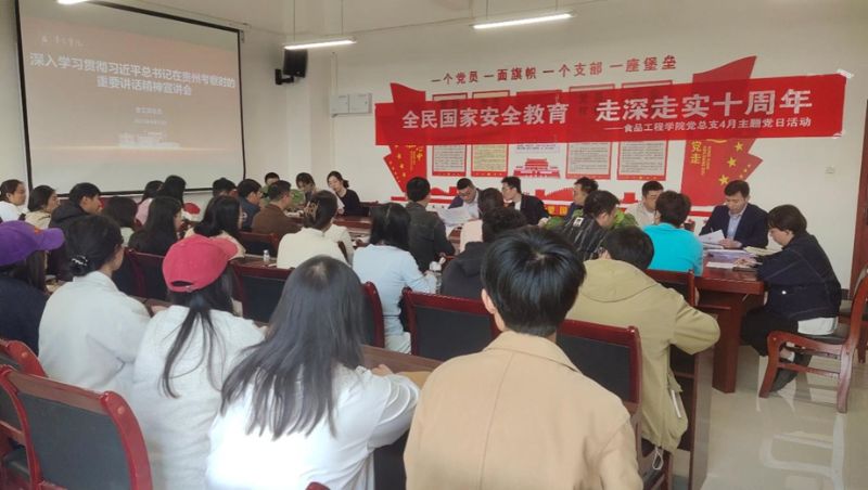 为牢记习近平总书记殷切嘱托,把思想和行动统一到习近平总书记考察贵州重要讲话精神上来,2025年4月15日,食品工程学院党总支组织开展了深入学习贯彻习近平总书记在贵州考察时重要讲话精神宣讲会,党总支书记布如宇作宣讲报告。