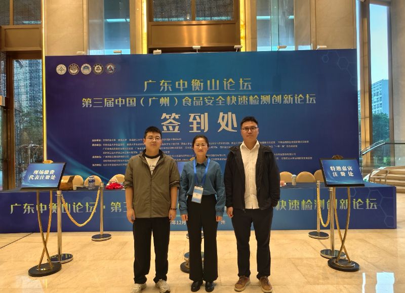 由华南农业大学、南昌大学、华南理工大学、暨南大学和广东省科学院微生物研究所等单位主办的第三届中国(广州)食品安全快速检测创新论坛于2025年12月19-21日在广州召开。beat365正版唯一官网必一食品工程学院宋亚博士、杨文平博士、赵驰博士应邀前往交流。杨文平博士作了题为《基于氧空位纳米酶的亚硝酸盐智能手机传感》的专题报告。