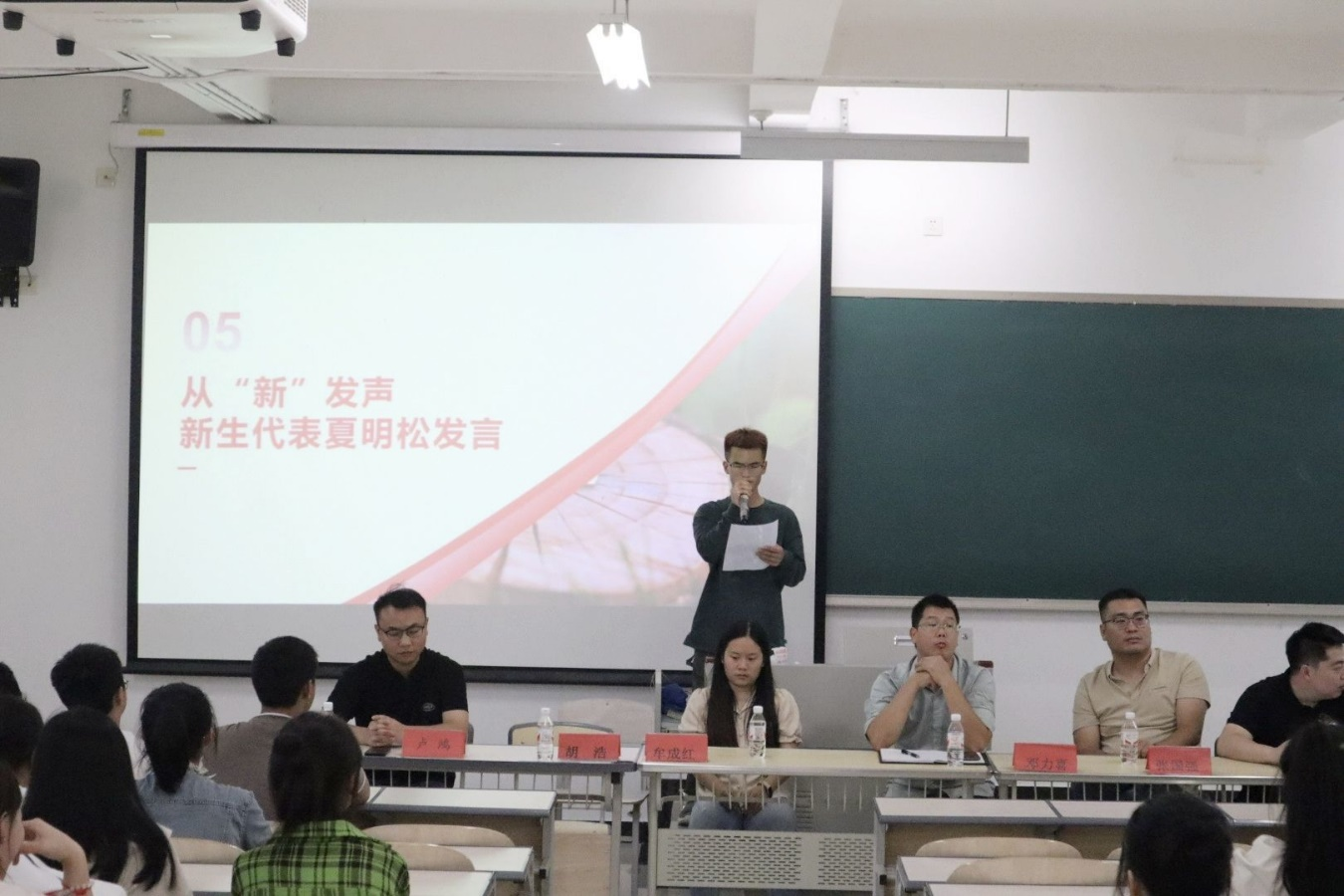从“新”发声,新生代表夏明松发言。第一:明确目标,勤学善思。第二:学以致用,开拓创新。第三:提高素质,抓住机遇,迎接挑战。谨记校训,牢记院训,立志成才。