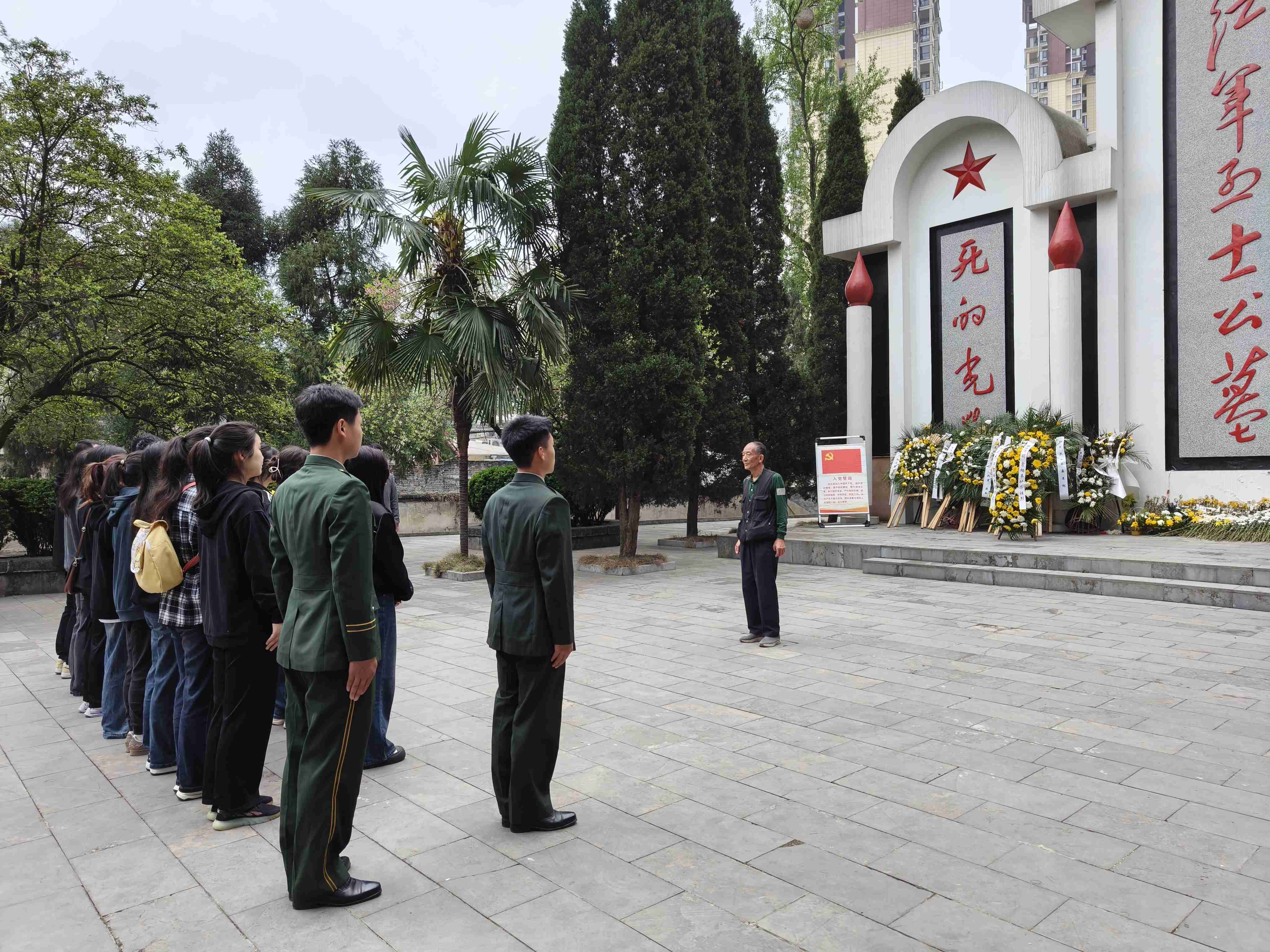资源环境系学生退伍军人代表张家骏、陈国林向烈士敬献花圈。全体党员师生在纪念碑前为革命烈士敬献鲜花、默哀鞠躬,表达对革命先烈的沉痛哀悼和深切怀念。